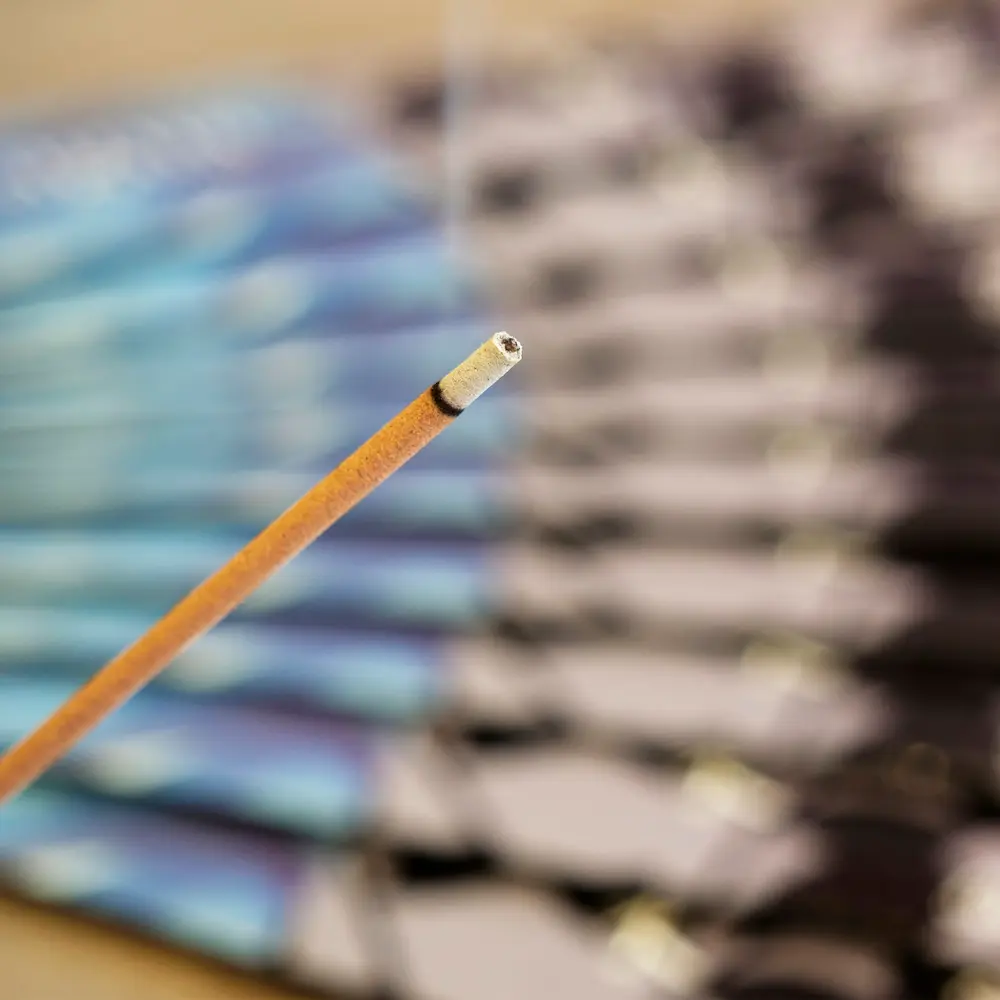 Coloca la varilla sobre un porta-incienso adecuado. Enciende el extremo, deja arder unos segundos y luego sopla la llama. El humo fragante perfumará suavemente tu espacio.
